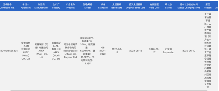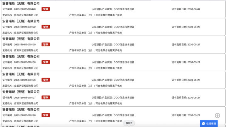国家市场监管总局全国认证认可信息公共服务平台显示,安普瑞斯(无锡)有限公司的多个相关电池及电芯产品3C认证证书处于“暂停”或“撤销”状态。澎湃新闻粗略统计,撤销和暂停的证书超60个,产品名称及单元(主)包括可充电聚合物锂离子电池、锂离子电池、二次锂离子电池、锂离子电池组、可充锂电子电芯、可充电锂离子聚合物电芯等。